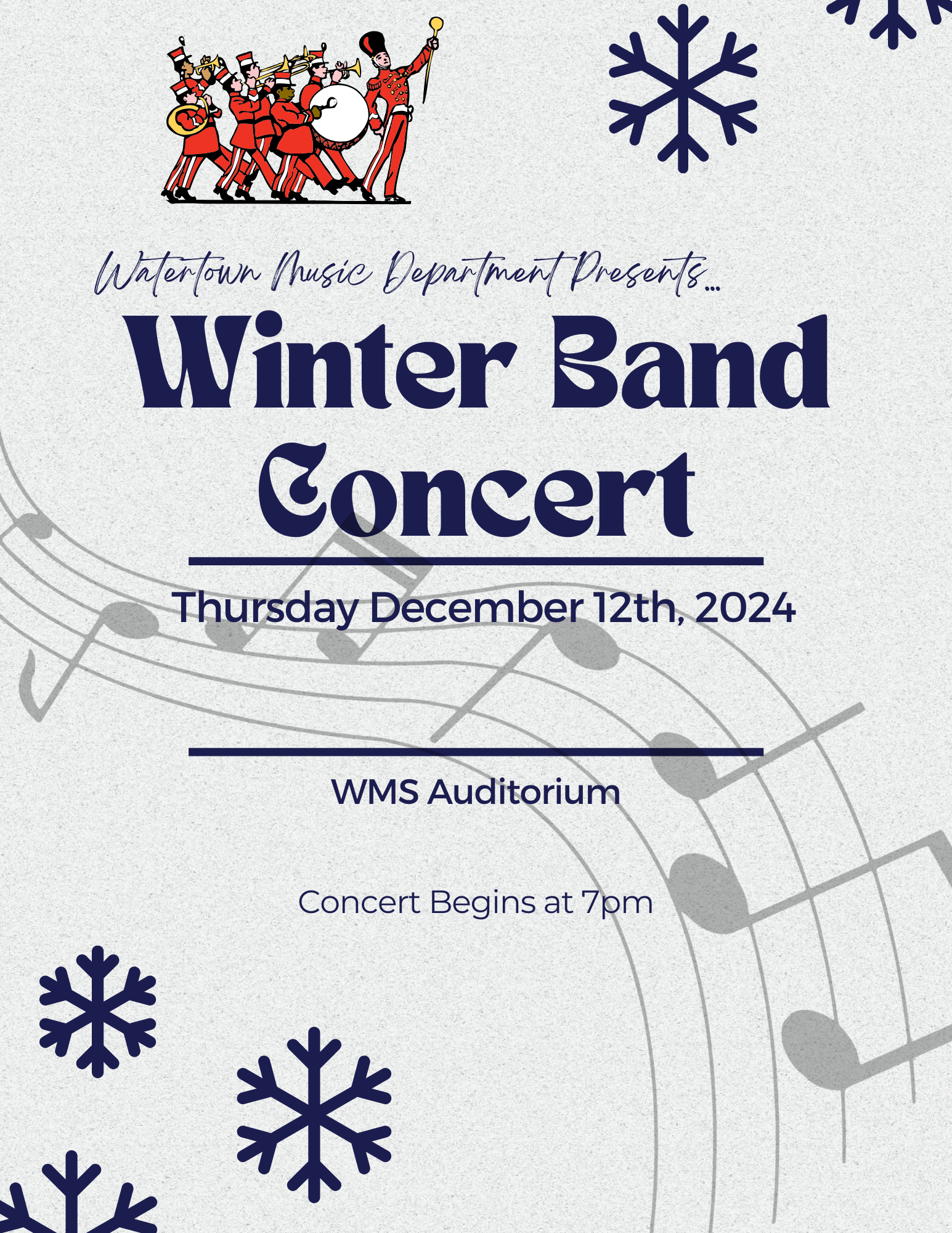 Watertown Music Department Presents the Winter Band Concert. Students from grades 6-12 will be performing on Thursday, December 12th at 7:00pm in the WMS Auditorium! Come and enjoy the show!