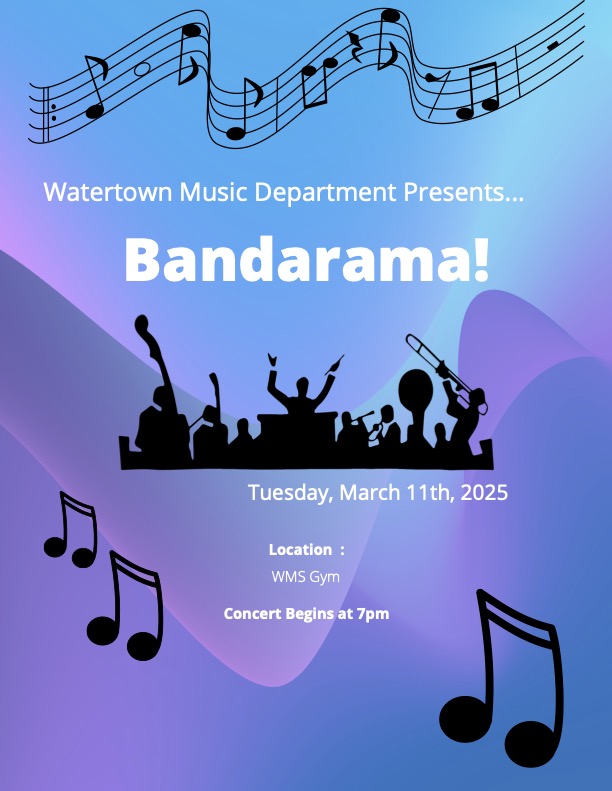 The Watertown Music Department presents Band-A-Rama! Students from grades 4-12 will be playing together to showcase their skills. Come and watch our student performers on Tuesday, March 11th at 7:00pm in the WMS Gym.