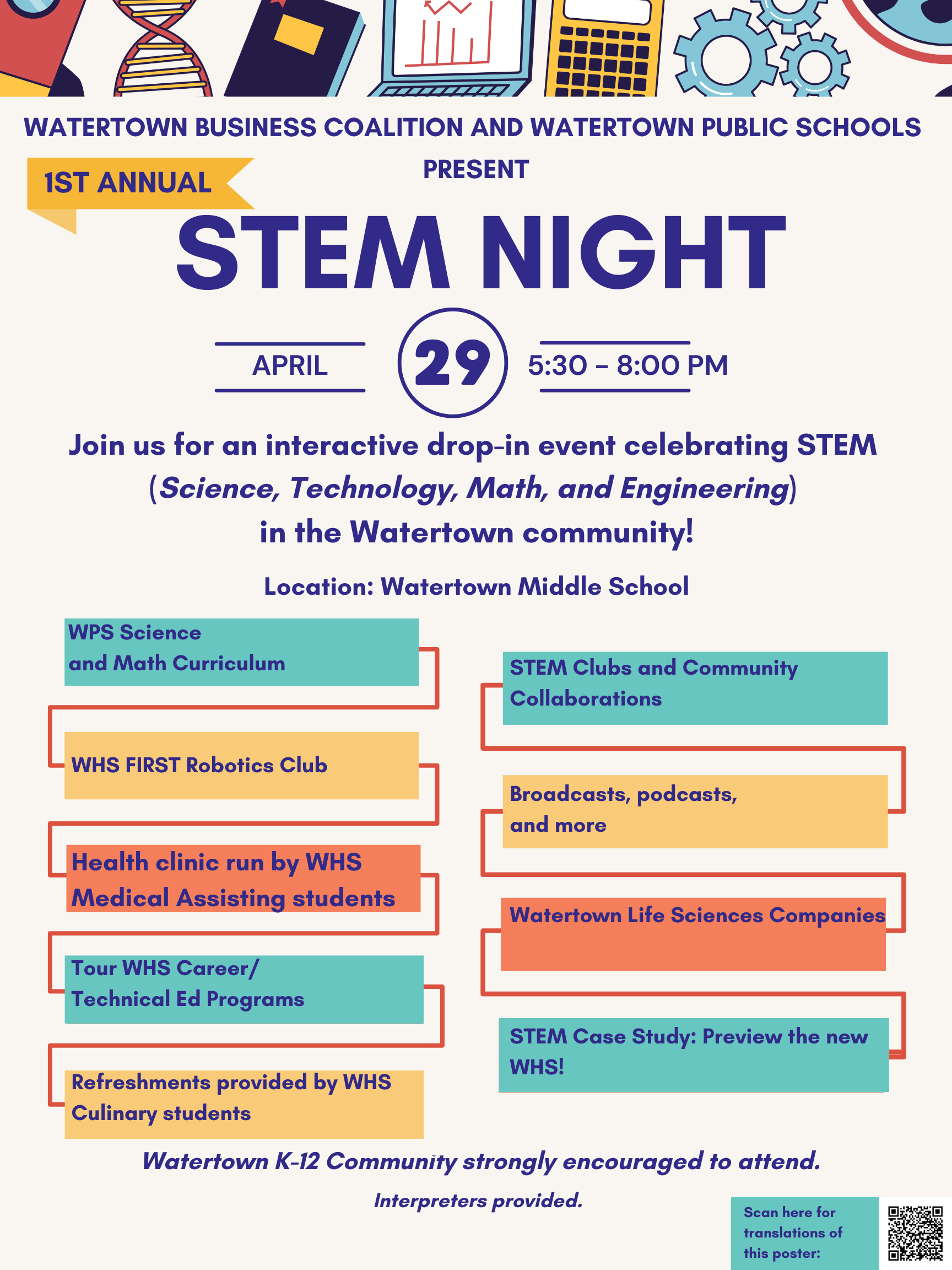 The Watertown Business Coalition (WBC) and the Watertown Public Schools are putting on a first-of-its-kind STEM Night celebrating Science, Technology, Engineering & Math in the Watertown Community!
